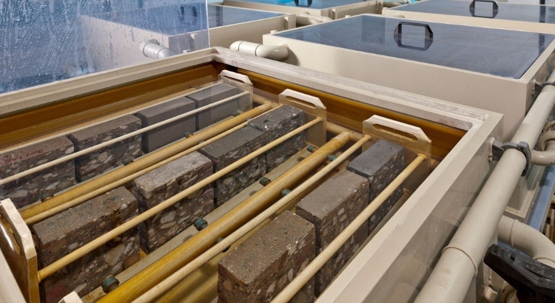 A major strength of the method is that the depth of damage to the concrete is directly visualized by microscopic methods and quantitatively determined in mm/stress period (see following figure).