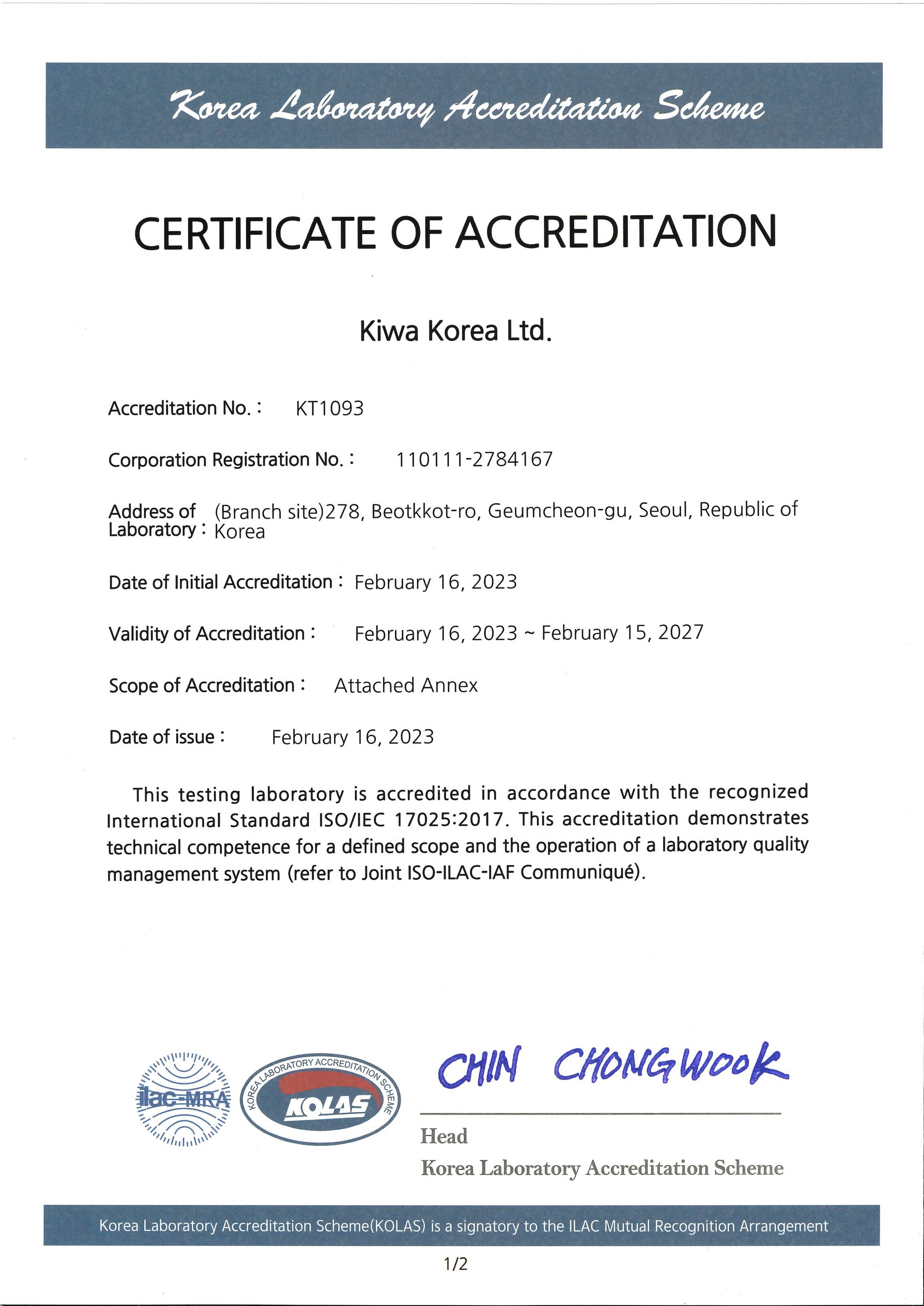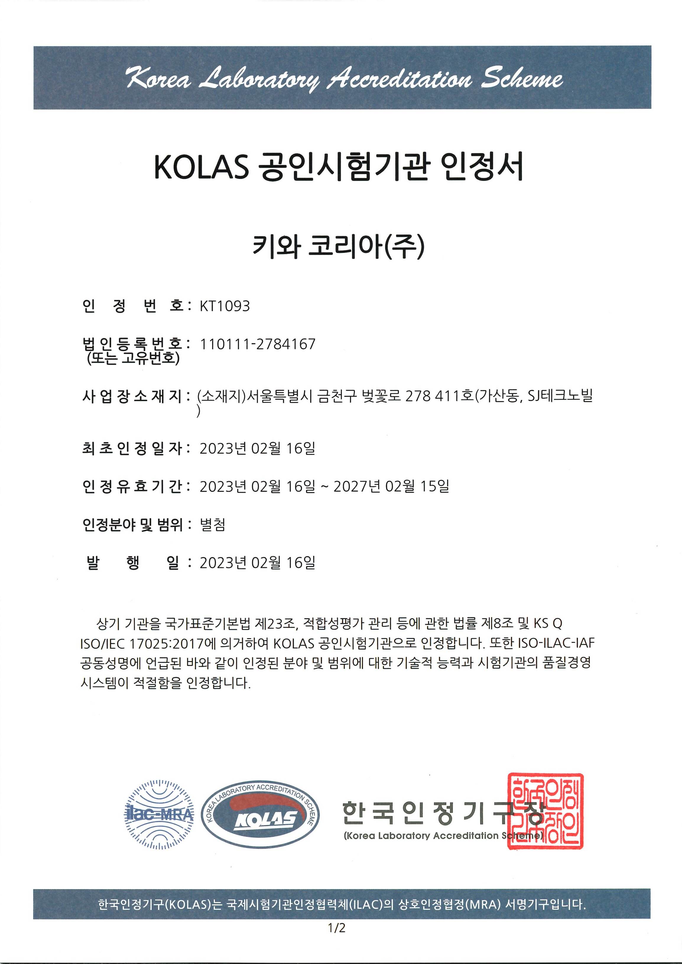 On February 16, 2023, Kiwa Korea was accredited as an "Authorized testing institution" by the Korea Laboratory Accreditation Scheme (KOLAS).