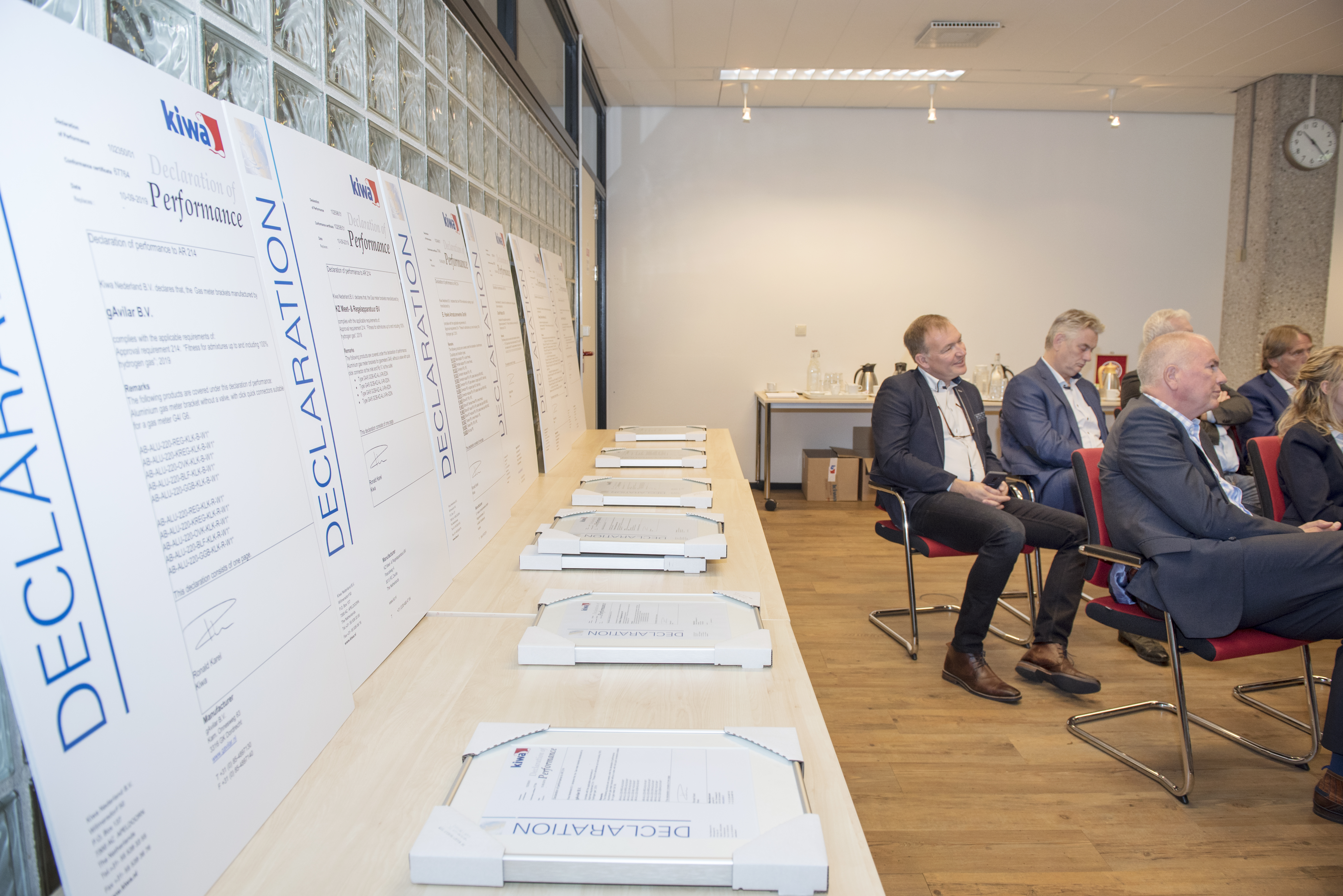 Kiwa reikte op 10 september de eerste certificaten uit in het kader van de nieuwe keuringseis KE 214 ‘Geschiktheid voor bijmenging tot en met 100% waterstofgas’. Deze keuringseis bevat eisen voor componenten die worden gebruikt in waterstofgasnetwerken. Negen fabrikanten ontvingen het KE 214 certificaat uit handen van Kiwa’s Ronald Karel en Bart Vogelzang, voorzitter van het College van Deskundigen.